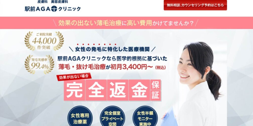 | 特徴 | オリジナル発毛薬「Rebirth」で99.4%の発毛実感率 プライバシーに配慮した完全予約制・個室対応 駅から徒歩5分以内の好立地 |